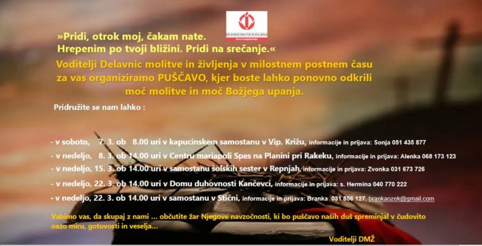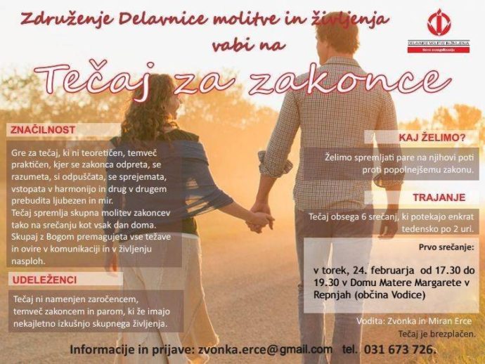 “Združenje DMŽ Slovenija organizira Tečaj za zakonce, ki bo potekal v Domu Matere Margarete v Repnjah (občina Vodice) v torkih […]