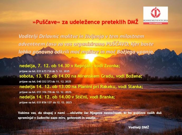 Prvi vikend v novembru smo se voditelji Delavnic molitve in življenja odmaknili od naše vsakdanjosti v dom v Kančevce. Tam […]